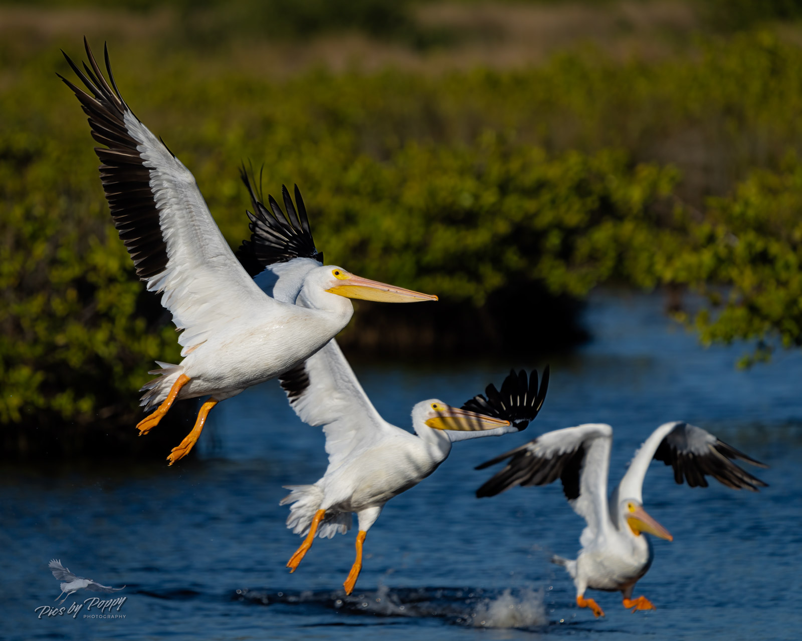 As we were preparing to leave, we spotted in the distance some white birds making their way towards us. They were scattered across the sky, in separate groupings and even at a great distance it did not take long to realize they were White Pelicans. Over the next 15 minutes or so the pelicans came flying in, individually or in groups, landing in the refuge pool not far from us. It is always a treat to see these large birds come flying in, grouped together this way. Being one of the largest flying birds in the world, weighing nearly 20 pounds and having a wingspan of 9 feet, it takes some effort to land this avian aircraft. As White Pelicans come in for a landing, it is a somewhat lengthy process. They come in on a slow glide, wings spread and as they approach the water’s surface, they put those bright orange webbed feet out, like landing gear on a 747. They carefully skid across the water’s surface as they slowly come to a stop, then give their tail feathers a shake before wadding on through the water. After they all arrived, my wife and I watched as they interacted with each other, flying and chattering about, forming into pods as they started to feed on the pool’s grass bed.