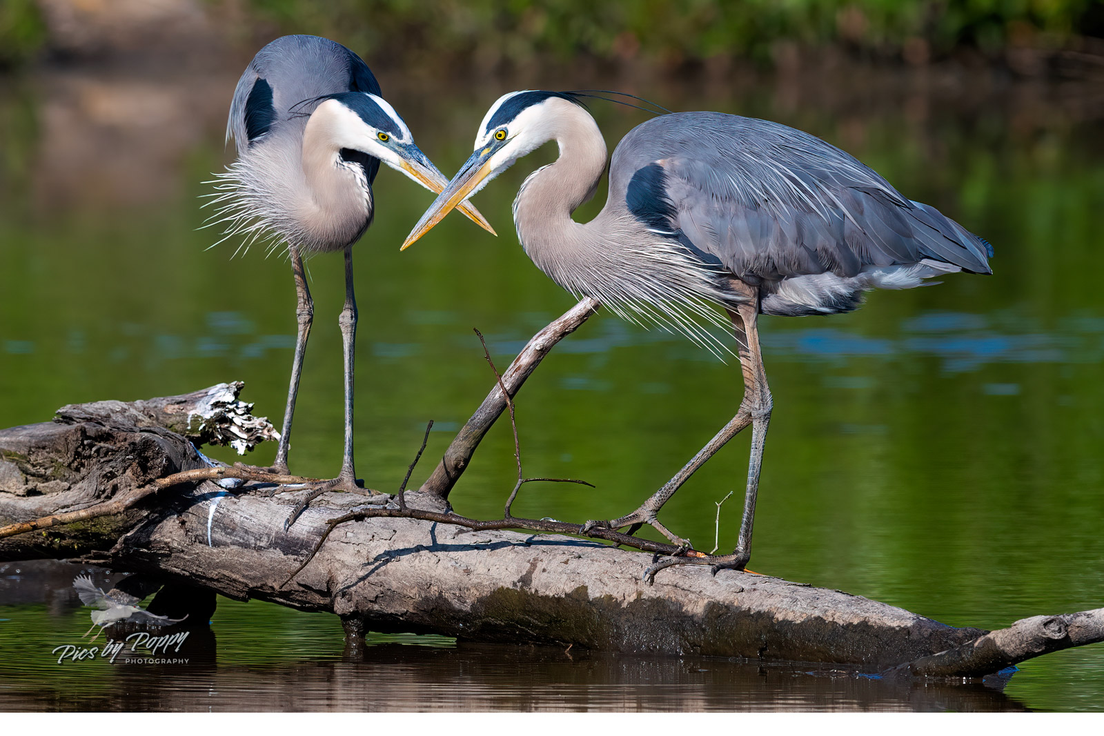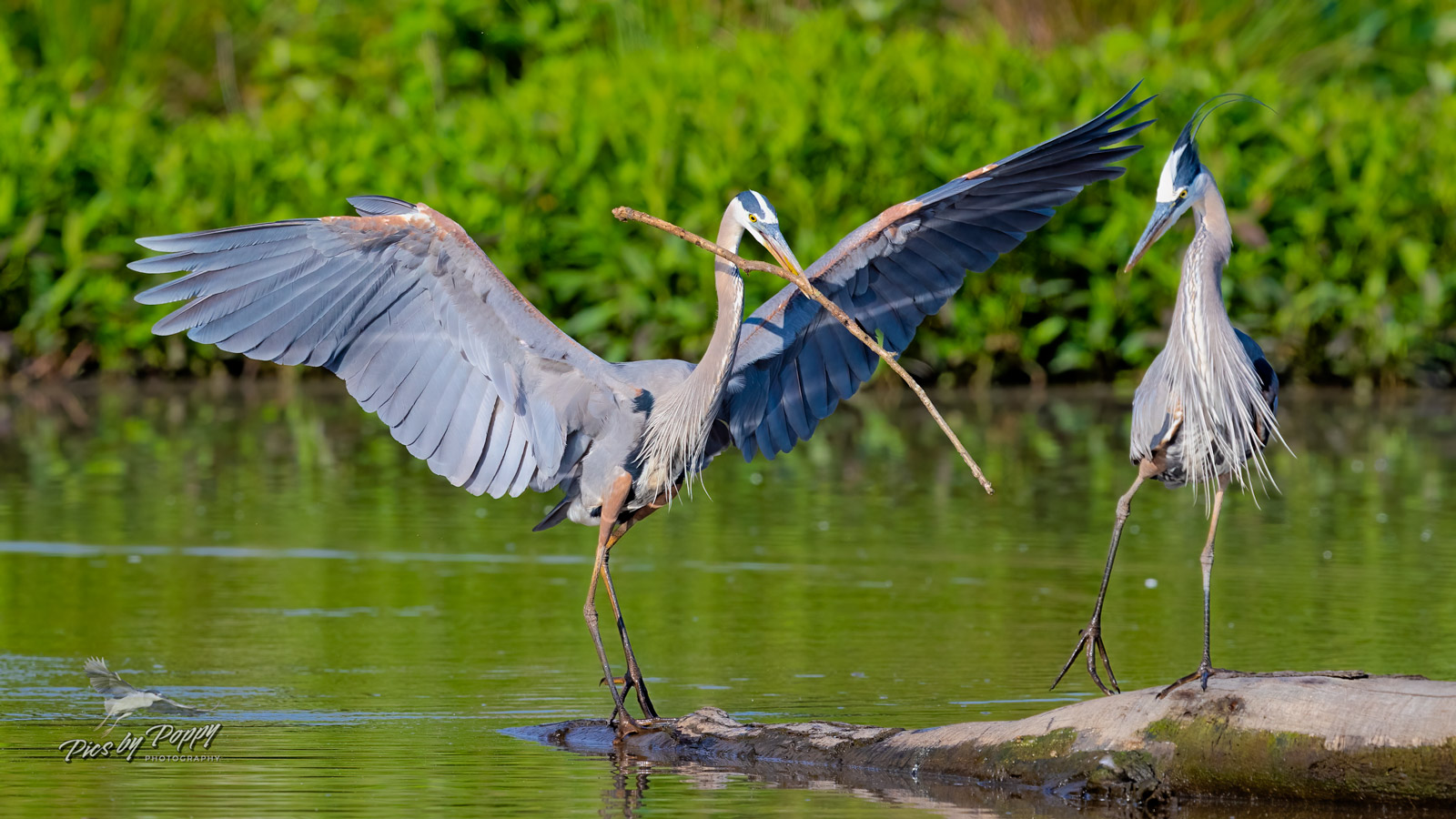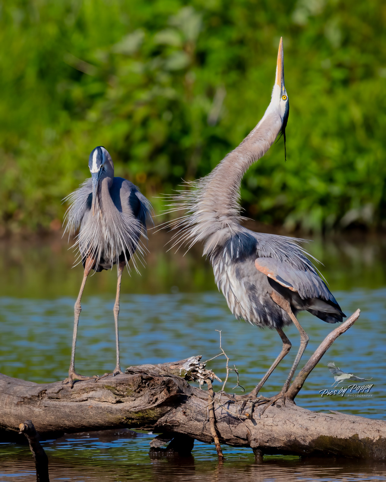 I was spending the morning chasing some Redheaded Woodpeckers, Northern Flickers, a single Green Heron and the occasional Osprey when a mating pair of Great Blue Herons decided to show up. I spent the next hour and a half capturing image after image of these two herons putting on a show of dancing courtship. The male made many trips to the woods to retrieve a branch or stick to offer his mate, and then they would precede to enter a display of dance and courting activity that was amazing to see. This courtship included bill snapping, neck stretching, preening, stick exchange, crest raising and bill play.