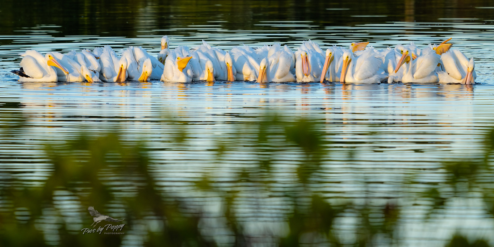 As we were watching the pelican activity, I watched this one pod of pelicans form together as they floated along feeding on the pool’s grass bed. As they would feed, each pelican would dip its head deep into the water completely submerging its head and neck as it would reach to the bottom of the pool to grab mouthfuls of grass. They would throw their heads back hard as they tried to get the grass deeper in their mouths to swallow. Back and forth we watched this action, each pelican having its own rhythm of feeding, head in, head out, constant movement of hungry White Pelicans feeding.